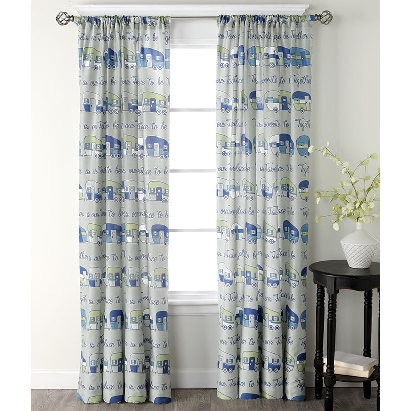 Decorate any room or a camper with this Our Favorite Place is Together Window Panels. The pattern features campers against a gray ground and the sentiment “Together is Our Favorite Place to Be”. Panels available in 2 sizes and includes a rod pocket for easy hanging.