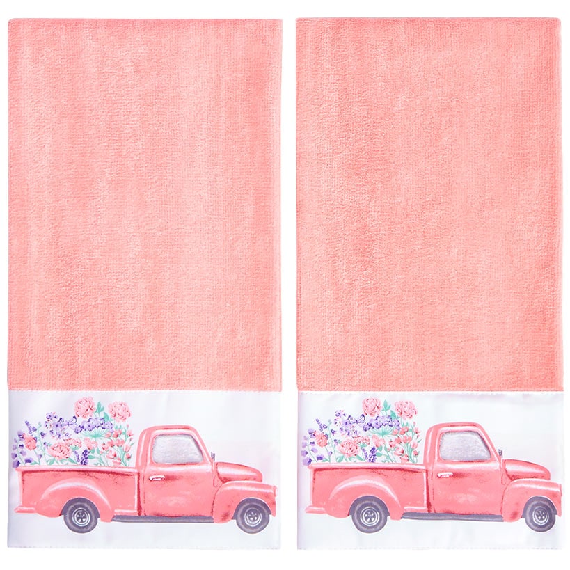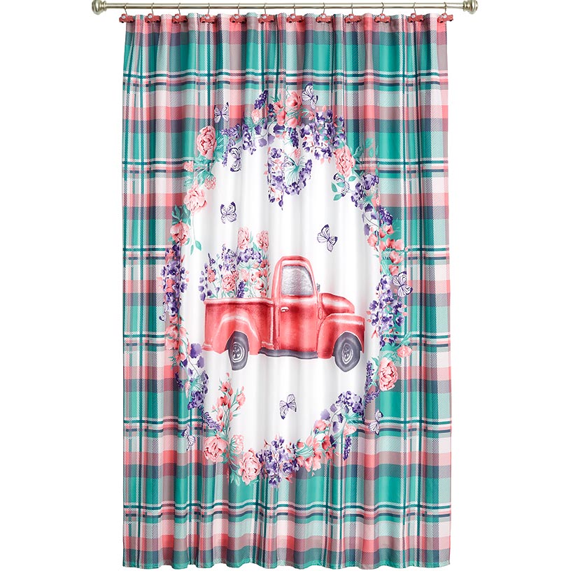 The Spring Truck Shower Curtain, Set of 2 Hand Towels and Valance bring a bit of fresh spring colors to your bathroom decor. Fun shades of pink and green bring the space to life. Install the Shower Curtain and hang the Set of 2 Hand Towels which feature an embroided design on one edge. A cheerful plaid decorates the Valance.